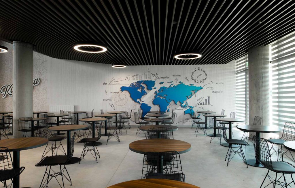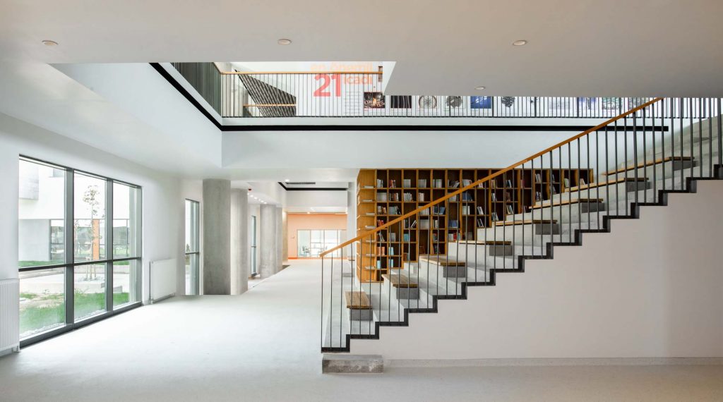 The large courtyard welcomes you as soon as you step into the school, offering the first impression of its modern architectural texture. A spacious and open design gives students the opportunity to move around and interact freely. The high-ceilinged entrance hall offers students a wide perspective and creates an ideal space for gathering.